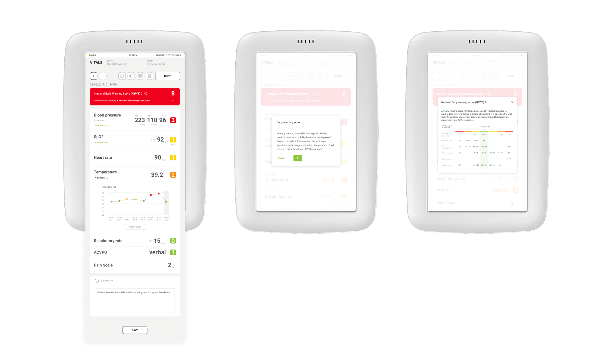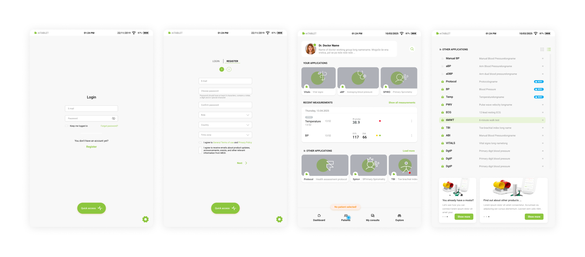 During my work with MESI, I contributed to the design and user experience of their core product - the mTABLET medical device. My role focused on Product Design and UX Design across several key projects, including the planning and design of a new diagnostic measurement called VITALS, the user interface for MESI mRECORDS, a digital health record platform, and the continuous improvement of functionalities and user experience across existing MESI measurements.